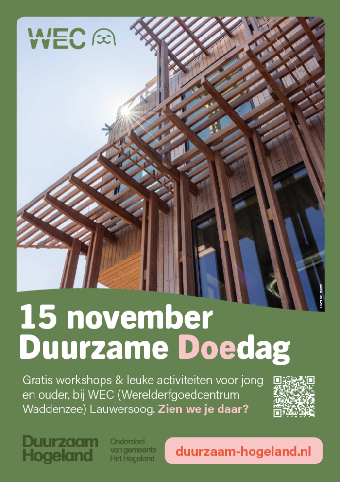 📅 Zet in je agenda: zaterdag 15 november 2025 – Duurzame Doedag bij het Werelderfgoedcentrum in Lauwersoog, met diverse activiteiten.